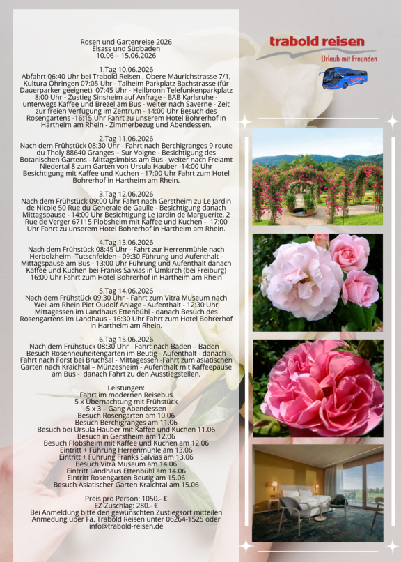 Rosen- und Gartenreise 2026: 10. - 15. Juni Elsaß und Südbaden